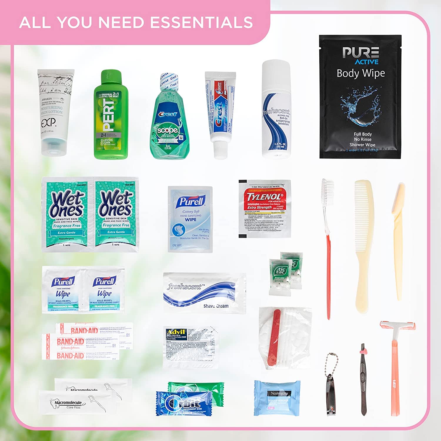 TOILETRY ESSENTIALS KITS - Toothpaste, Tooth brush, Mouth wash, Shampoo, Deodorant, Hand wipe, Hand cream, Tylnol, Advl, Cotton Pads, Cotton Swabs, Nail File, Nail clipper, Tweezers, Comb, Body wipes, Makeup remover, Shavers, Shaving cream, Mint, Gum, Dental floss, Bandages