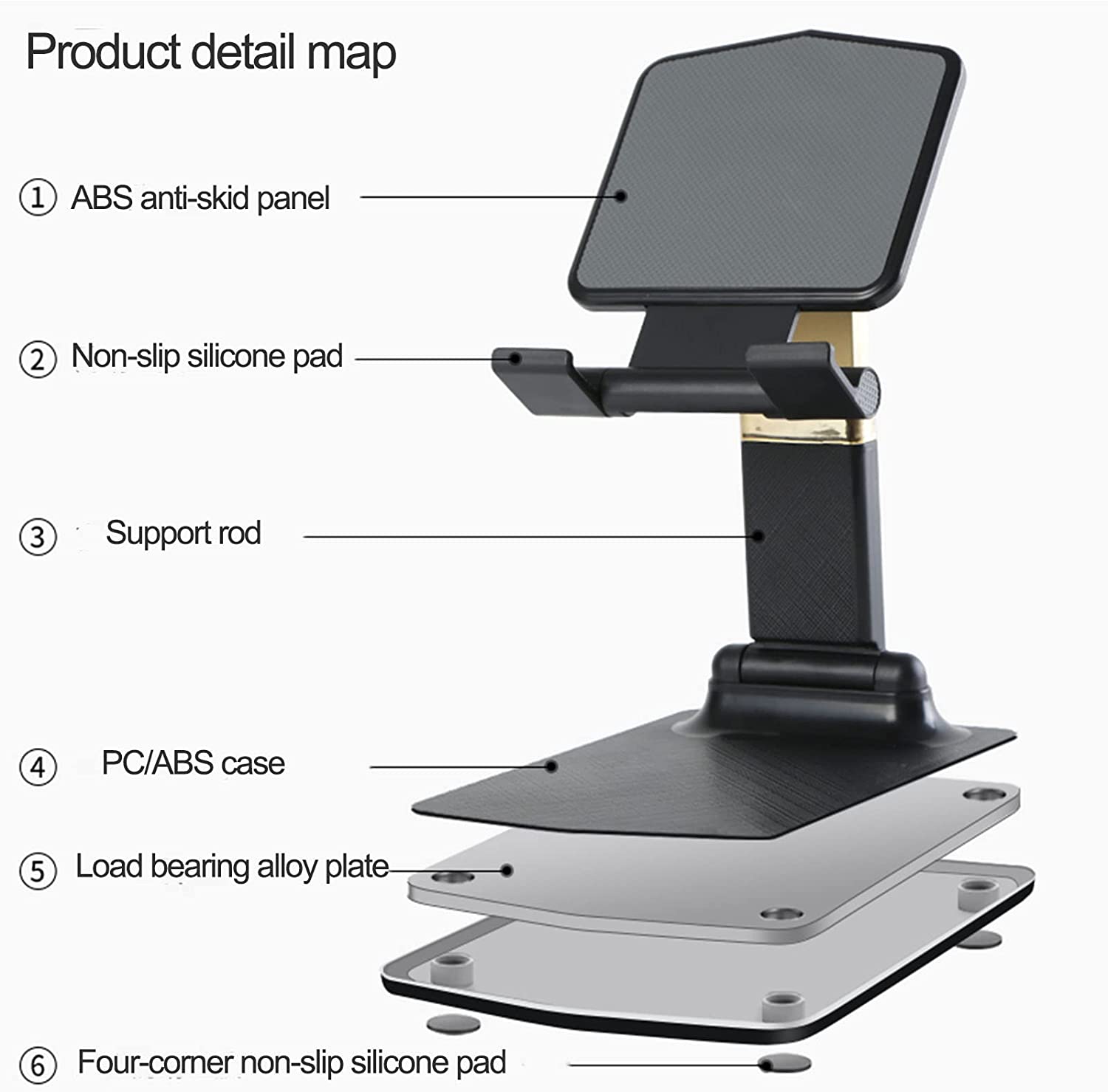 【STURDY AND DURABLE】: The base of the tablet desktop stand is reinforced with an alloy plate, which is stable enough. The four-corner silicone pads on the bottom prevent it from slipping, making the stand more stable. The soft glue on the bracket has a good function of protecting the tablet or mobile phone from scratches and bruises.