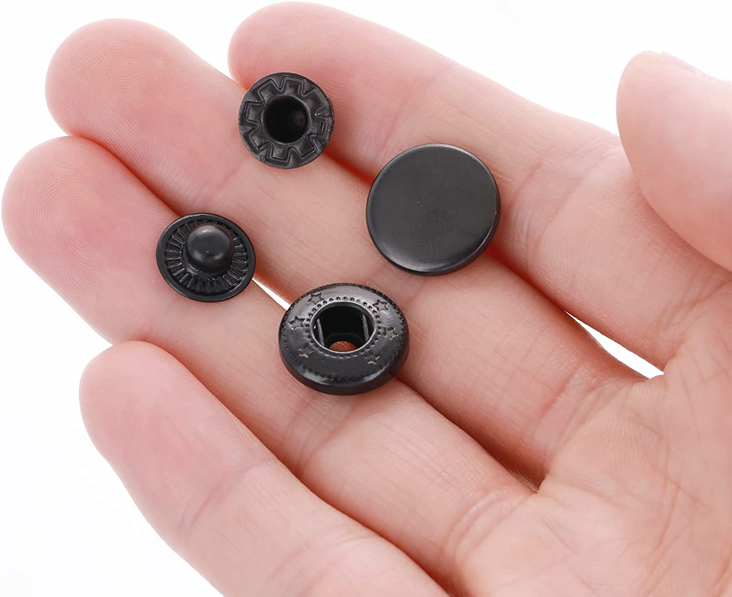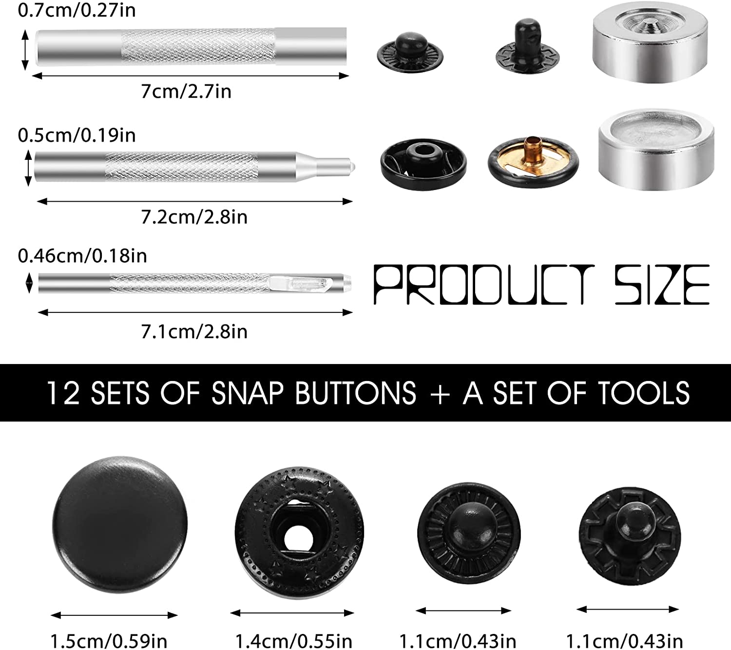 • Product Size: clothing leather snaps' diameter is about 0.59 inch / 15mm, the height is about 6mm, and each set is composed of (cap + socket) with (stud + post). Note: suitable for light to medium fabric, not for thick fabric.