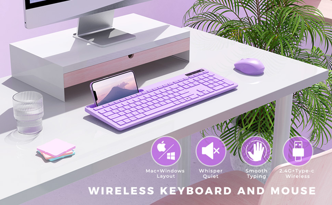 - Productive and Aesthetic -- Improve your computing experience throughout the day with the responsive and well-shaped keys of the purple wireless keyboard. Refresh your workspace with the modern contours and sleek lines in a romantic peach taro purple color, the cute keyboard and mouse will be a fantastic ornament to complement a lovely and contemporary desktop!