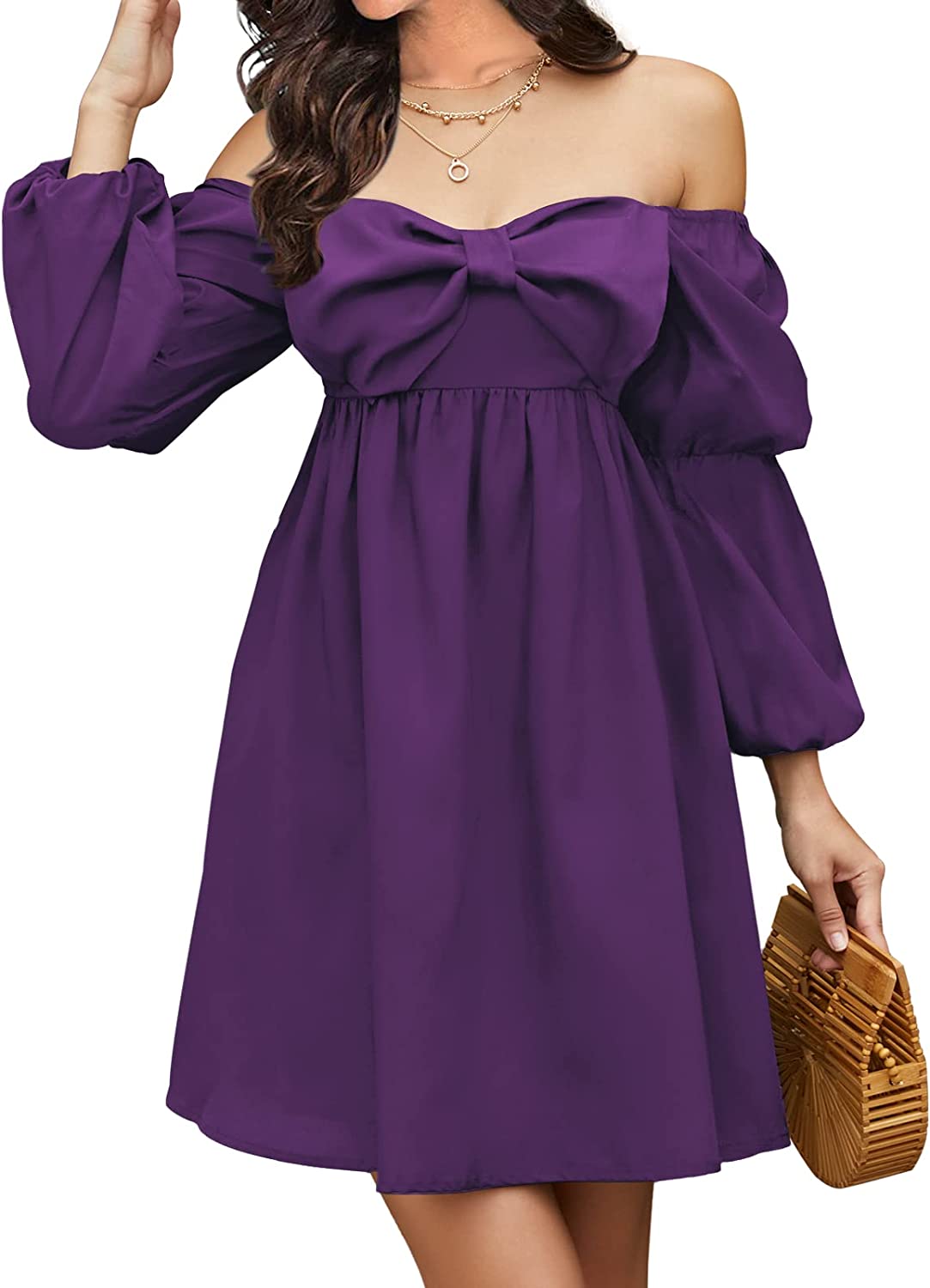 EXLURA Womens Summer Casual Wedding Guest Dress Square Bow Neck Long Puff Sleeve Dress Empire Waist Babydoll Mini Dress