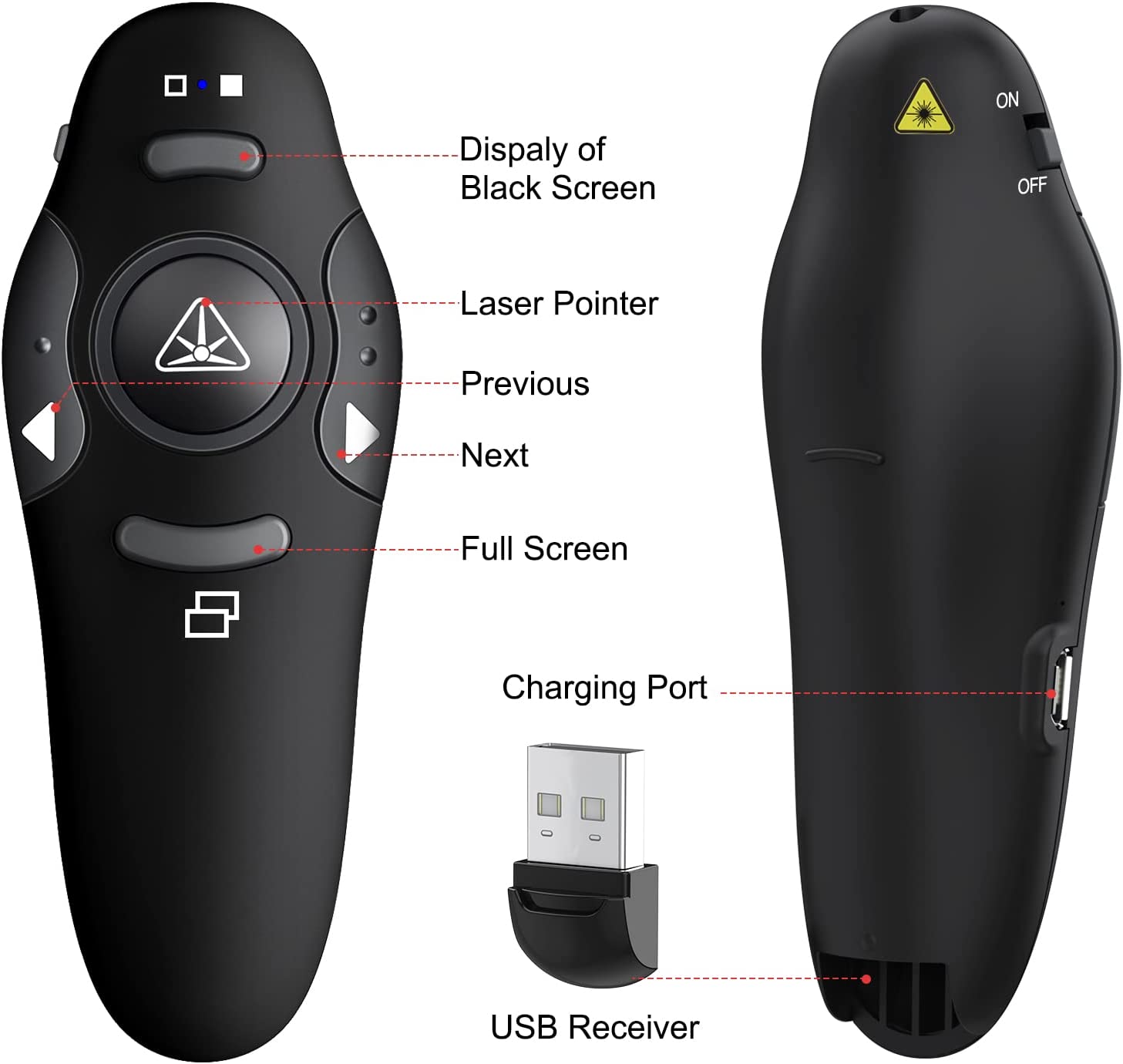 【RECHARGEABLE WIRELESS PRESENTER CONTROL】The slide clicker built-in 300mah battery, 1.5 hours of charging can be used for several weeks, there is a smart sleep mode, sliding the clicker will enter the sleep mode, not in use automatically shut down to save power. Essential presentation tools for the classroom or office.