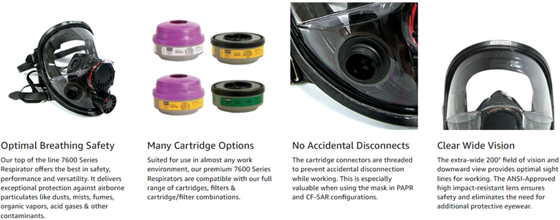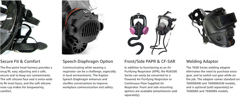 • Product 1: Secure Fit & Seal: Silicone Seal Provides Excellent Barrier Against Contaminants; Five-Point Head Strap Option Includes Center Strap For Easier Adjusting And A More Secure Fit; Cartridge Connector Is Threaded To Prevent Accidental Disconnection