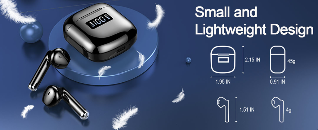 - Mini Ultra Lightweight and Ergonomic Design: Wireless earbuds are small, ultra-light and comfortable. Each earbud weighs only 4g, the ultra-light and ergonomic design allows you to wear them for a long time without feeling uncomfortable. Such a light weight will even make you ignore the earbuds in your ears. The size of the charging case is 2.15*1.95*0.91 inches, 0.1 lbs. Even if you carry out vigorous exercise with the charging case in your pocket, there will be no burden.