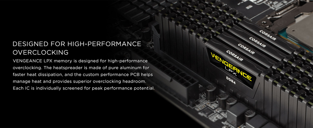 VENGEANCE LPX memory is designed for high-performance overclocking. The heatspreader is made of pure aluminum for faster heat dissipation, and the custom performance PCB helps manage heat and provides superior overclocking headroom. Each IC is individually screened for performance potential. The DDR4 form factor is optimised for the latest Intel and AMD DDR4 motherboards and offers higher frequencies, greater bandwidth, and lower power consumption than DDR3 modules. VENGEANCE LPX DDR4 modules are compatibility-tested across Intel DDR4 motherboards for reliably fast performance. They’re available in multiple colors to match your motherboard, your components, or just your style.