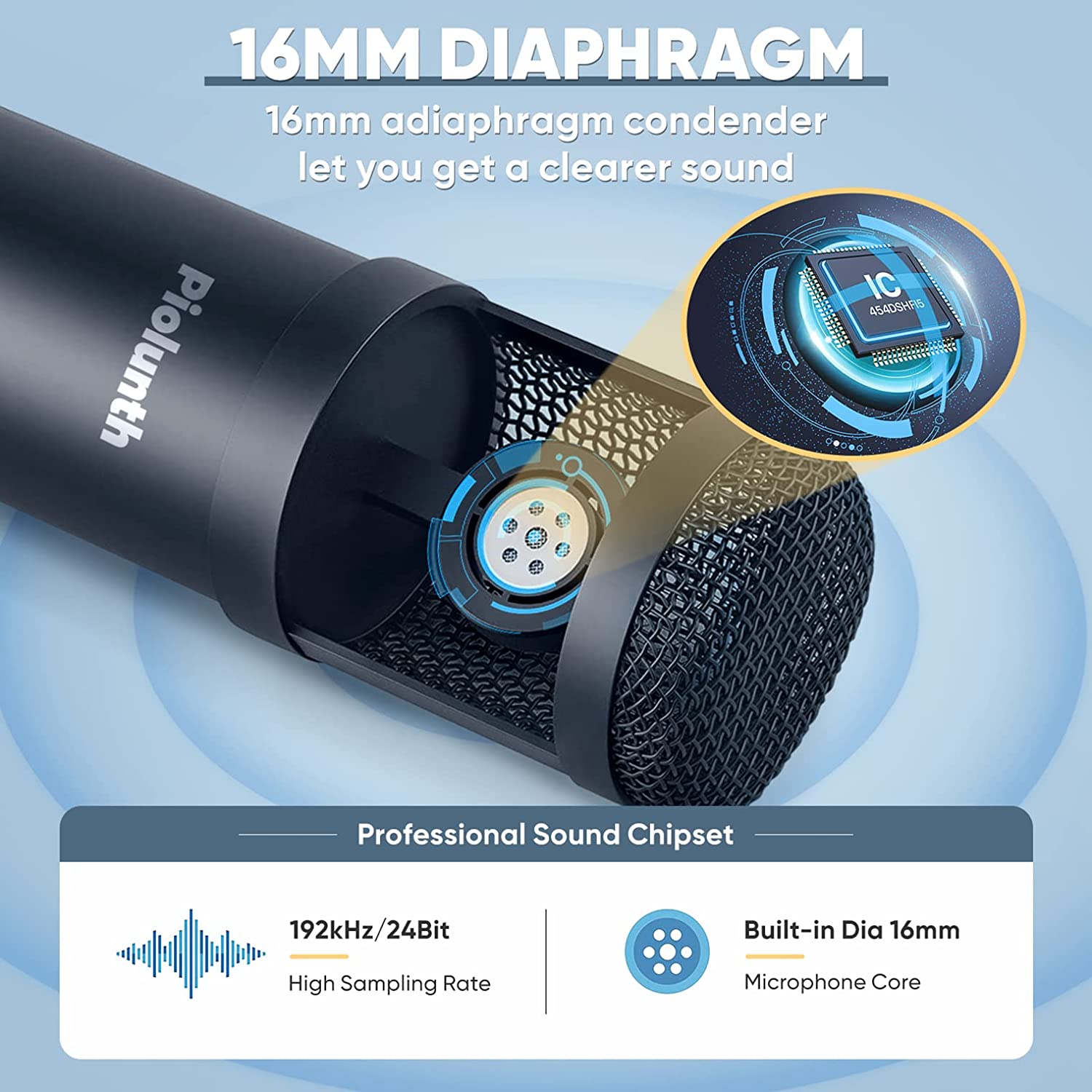 USB Microphone, This Condenser Microphone has been designed with professional sound chipset,16MM mic capsule design delivers rich, detailed sound. Supports sample rates up to 192kHz/24bit. Wide frequency response, and high sound pressure level enable the mic to obtain more real and delicate sound.