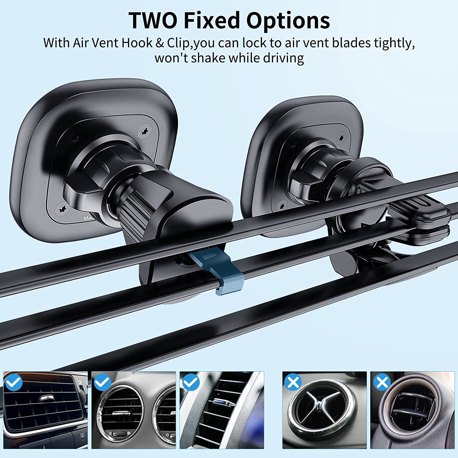 ?UPGRADE HOOK CLIP:The "hook shape" of this car phone holder mount creates "three gripping places" that firmly grasp the air outlet blades. Even when driving on uneven roads, it won't come off. The car mobile phone holder was created for innovation and usefulness, and it addresses the market's common issue of easy slipping off.