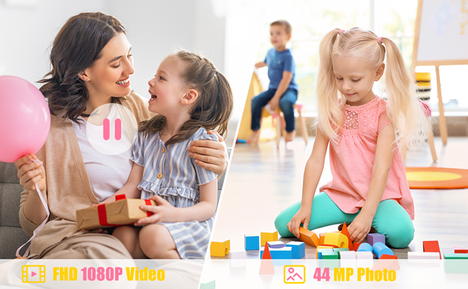 - [1080P 44MP FHD Digital Camera] This kids camera featured with 1080P FHD video resolution,44MP (max) picture pixel, largely enhancing image clarity, compare with other kid cameras. This children mini camera supports 16X digital zoom, you can zoom in or out images by using the W/T button. The pause function allows you to pause when record or playback videos. And the built-in fill light helps you to take quality pictures in the dark.