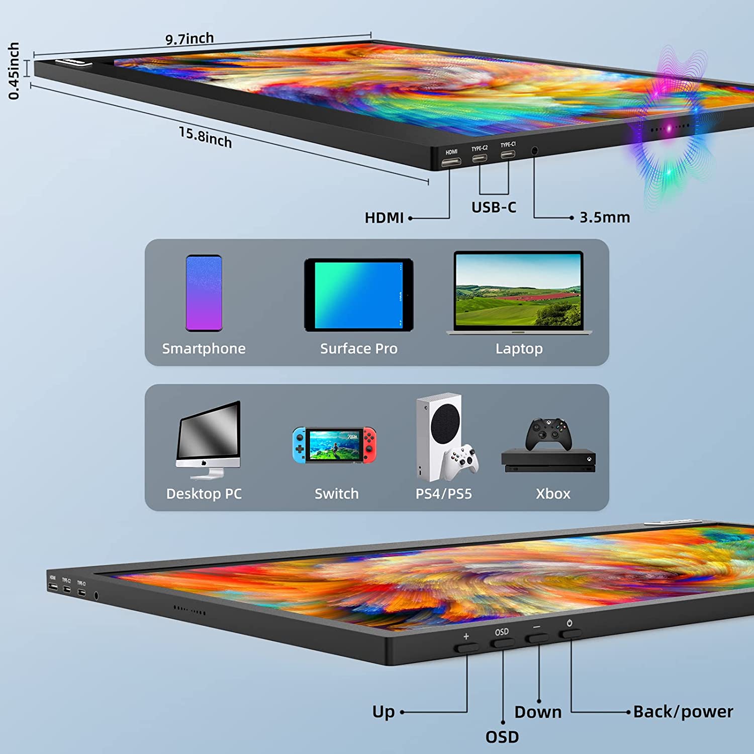 [Display parameters] 17.3 inches display area, 402mm*248mm portable size, dual speakers, independent portable stand, outdoor travel monitor, support USB C, full function, ring belt and mobile phone with HDMI interface, two USB-C cables, HDMI to switch Mini 1 HDMI cable, 1 PD charger (please use with the original cable and charger to prevent display failure)