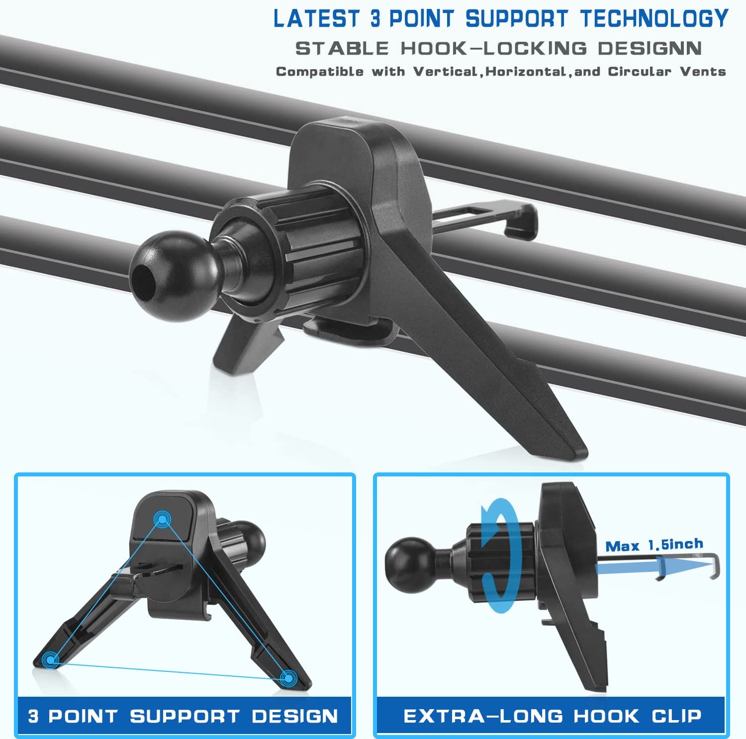 【Upgrade Triangle Stability Hook】:This car vent phone holder mount is designed as "Hook shape" and form "Three grasp points" which can firmly hook around the a/c vent for no slippage or movement. It solving the market's common problem of falling forward and off the air vent constantly when going over bumps or turns. Note:Only suitable for installation on air outlet