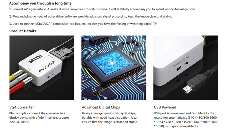 - 【VGA Converter】Connect the converter to a display device with VGA interface for monitoring the old AV red, yellow and white interface of set-top box DVD recorder and convert AV video signal to VGA.