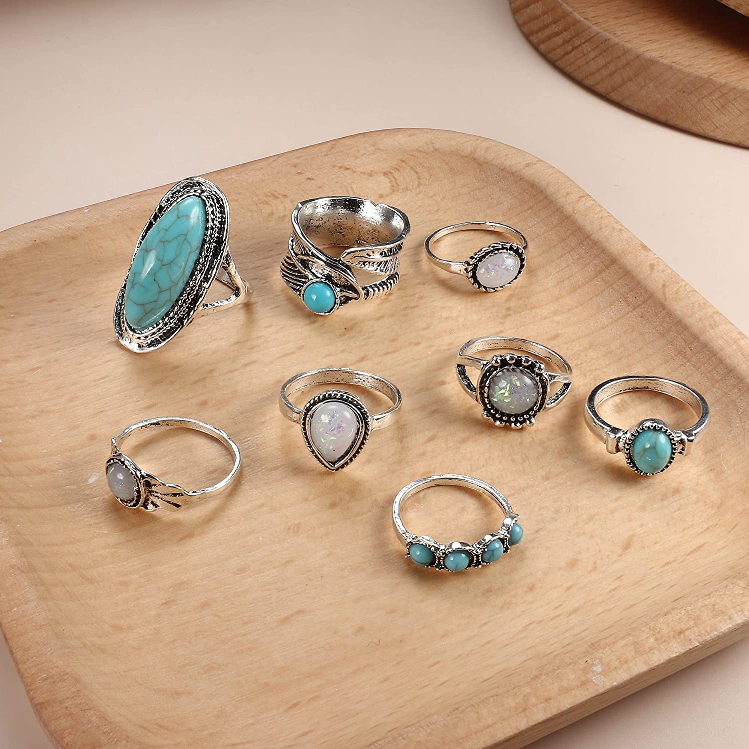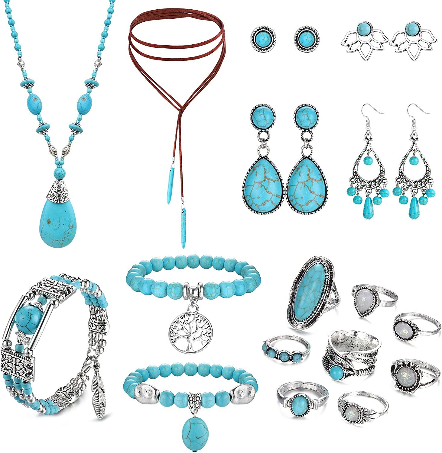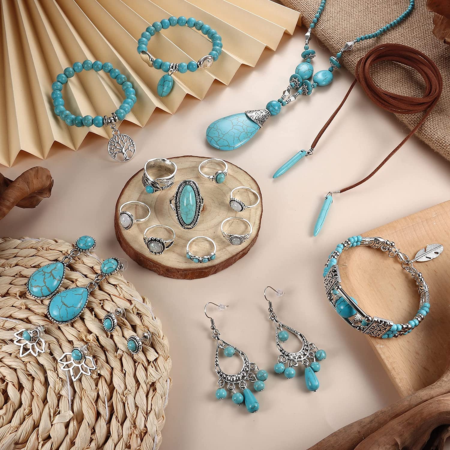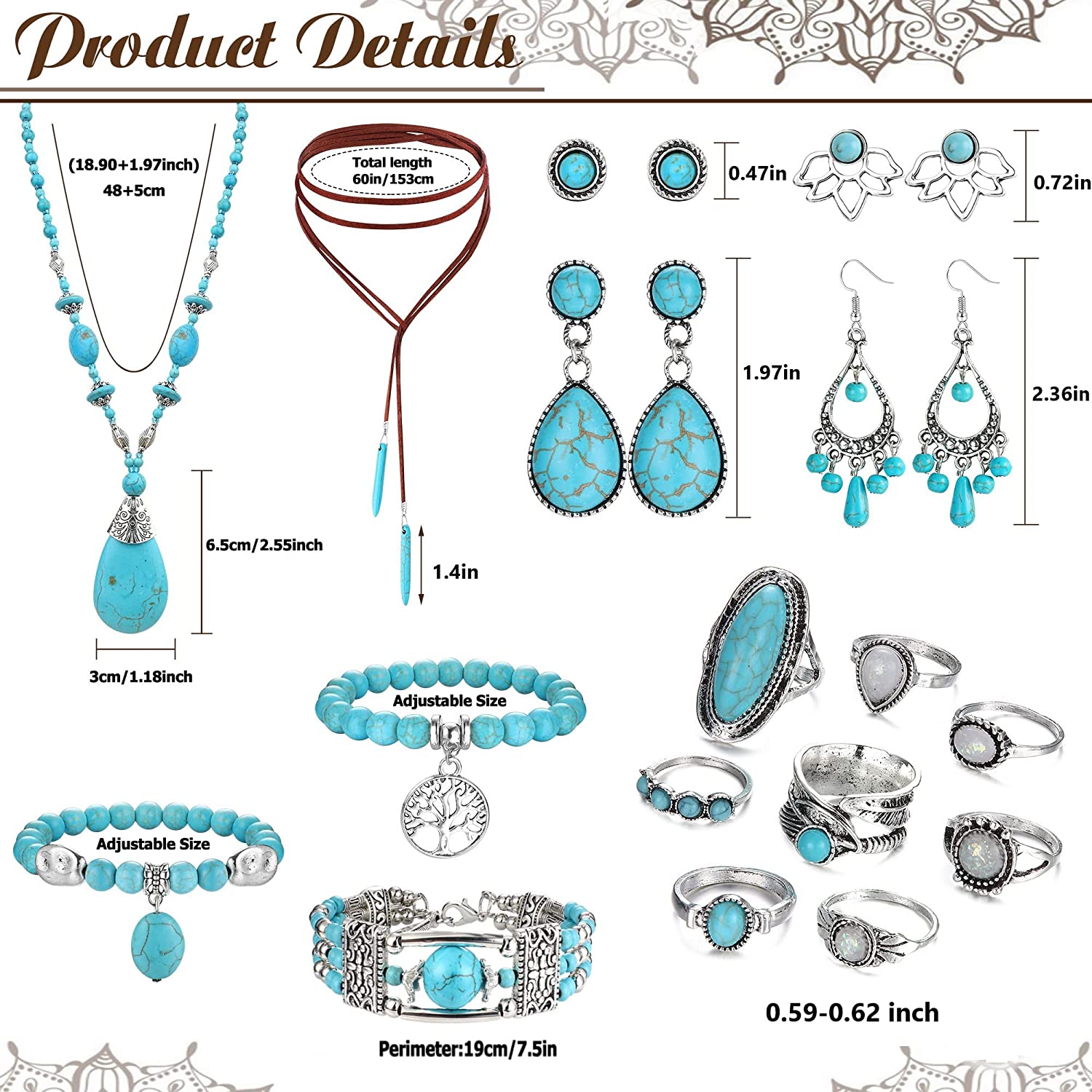 • 【TURQUOISE JEWELRY SET】Turquoise jewelry set includes 1 piece turquoise pendant necklace and 1 piece boho choker necklace, 1 piece layered turquoise bracelet and 2 piece adjustable turquoise bead bracelet,4 pairs of turquoise earrings and 8 pieces turquoise knuckle rings. Retro and fashion are perfectly combined to create a charming appearance for you.