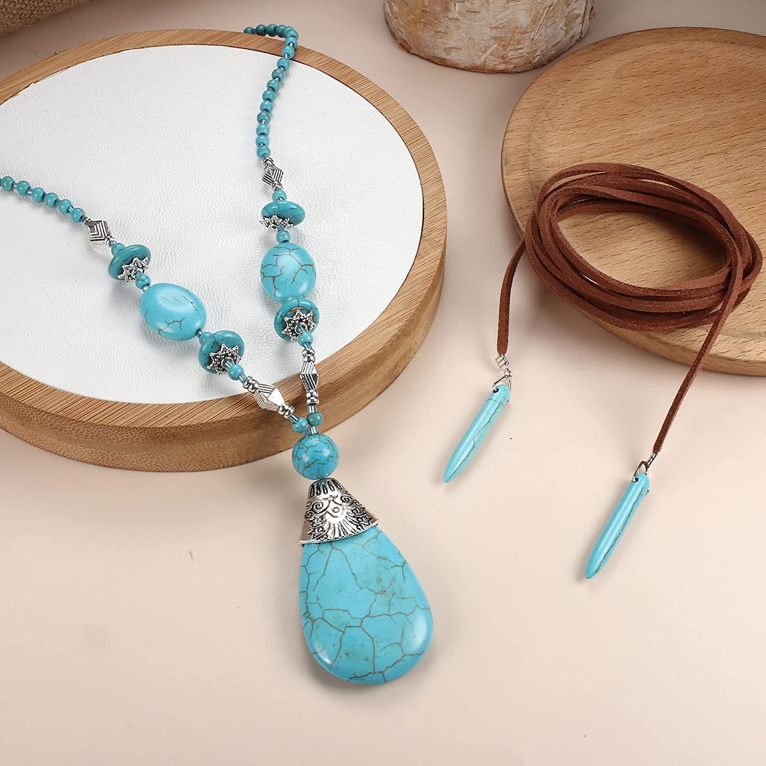 Florideco Bohemian Turquoise Jewelry Set Turquoise Pendant Necklace Turquoise Faux Leather Cuff Bracelet Turquoise Dangle Earrings Vintage Turquoise Knuckle Rings for