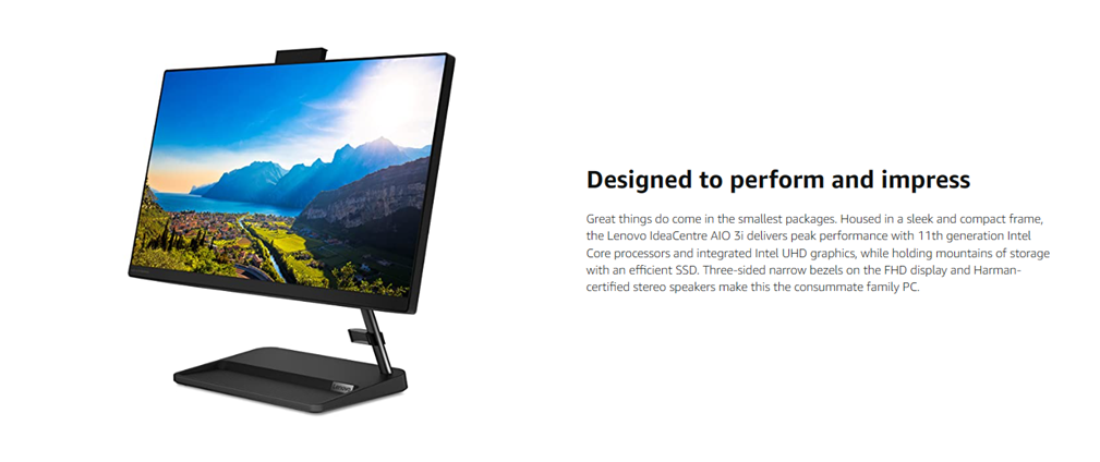 The IdeaCentre AIO 3i desktop computer is designed to perform and impress. This all-in-one computer is a pint-sized powerhouse, packing a wallop inside a compact chassis. Great things do come in the smallest packages, and housed in a sleek and compact frame, the Lenovo IdeaCentre AIO 3i delivers peak performance an 11th generation Intel® Core™ i3 processor, along with lightning-fast file transfer and boot times thanks to its 256GB SSD. Three-sided narrow bezels on the 22-inch FHD display and Harman®-certified stereo speakers make this the consummate family PC. It's great for personal productivity, working from home, or your child's schoolwork.Your household now has a store for its vast media library. Amass hundreds of movies and thousands of songs or videos with 256GB solid-state disk storage, which offers faster boot times, file transfers, and system responsiveness. Watch all of your favorites on the wide-angle full HD (1920 x 1080) touchscreen display, which also gives you more options for intuitive interaction with your computer - clicking and dragging files is easier than ever. This convenient AIO PC is made to make connecting simple, with a built-in webcam for videoconferencing and video chats that you can shut down for privacy. You'll also connect with wireless LAN (2x2 802.11 ac) and Bluetooth® combo card, plus multiple USB 2.0 and 3.2 ports, 1000 LAN, and HDMI™-out.