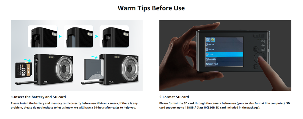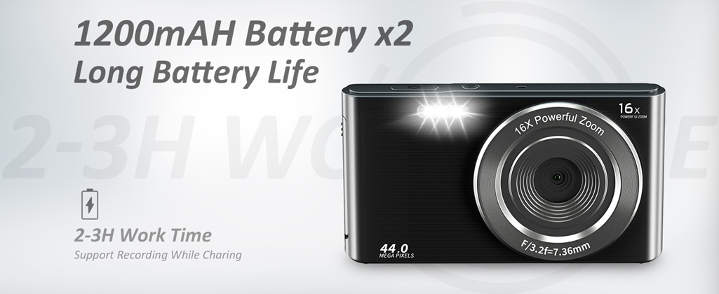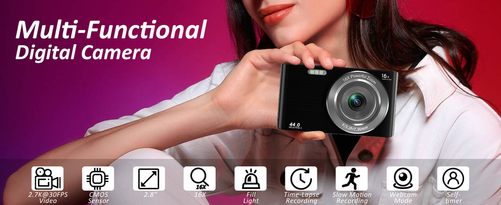 • 【4K & 44MP Digital Camera for Photography】NIKICAM 4k compact photography camera for kids girls boys adults has 4k video resolution and 44MP image resolution, and support 16X digital zoom, helping you capture and record the most exciting memorable moments with high-quality images or videos. This rechargeable digital camera come with a 32GB SD card, just turn the camera on and record the exciting moments wiht your family now!