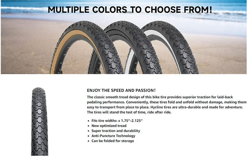 Hycline Bike Tire,24/26x2.125 Inch Folding Replacement Tire for Beach Cruiser Bicycle-White /Black/Brown