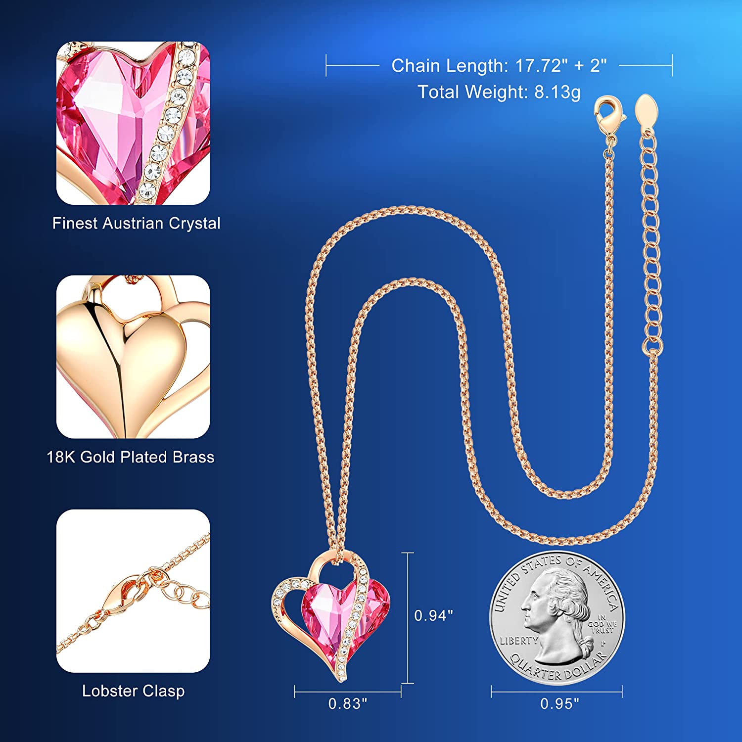 • Specification - Pendant Size: 0.94 x 0.83inch | Chain Length: 17.72 + 2inch | Plating: 18K Rose or White Gold Plated | Clasp: Lobster Claw.
