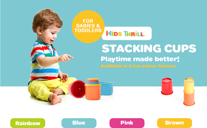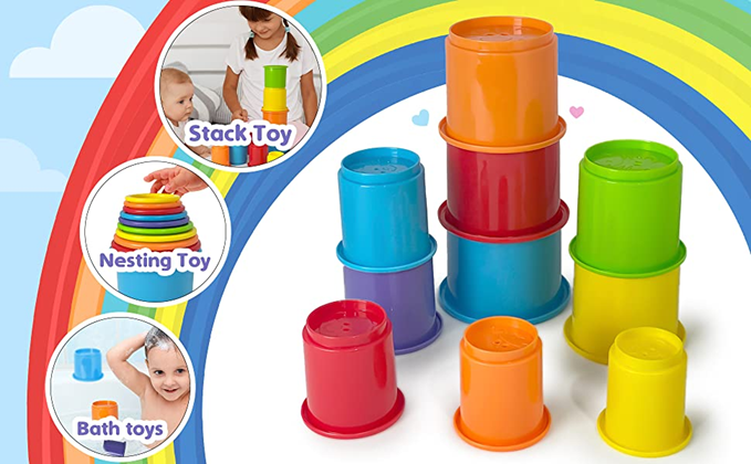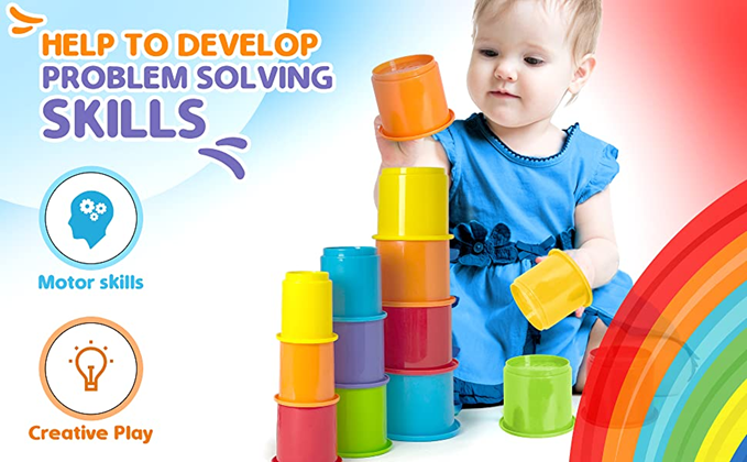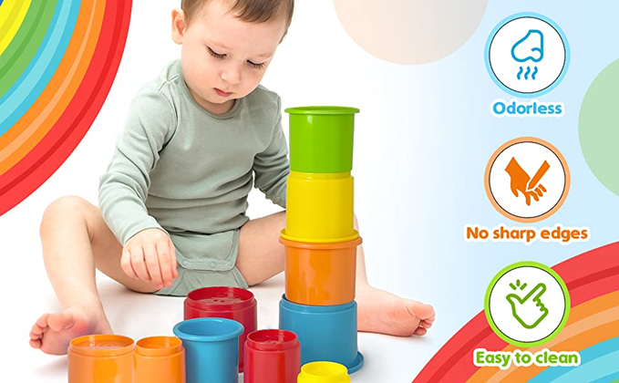 • Educational Toddler Toys. When Stacked Together, Our toys for babies Stacking Cups baby Toy Add Up To An Astonishing 63.5cm Tower That Your Little One Will Love. The ten pcs Baby Bath toy Cups Come In A Wide Range Of rainbow Colors That Will Instantly Grab Your Kid’s Attention.
