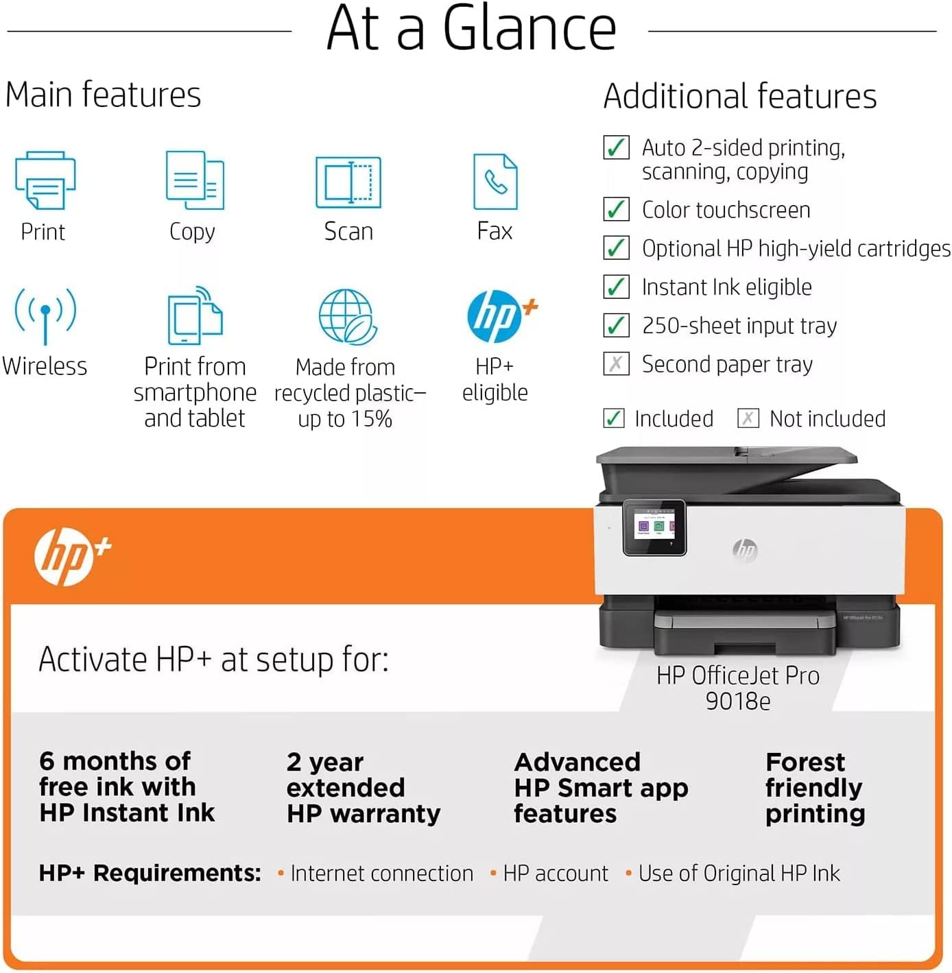 This printer is intended to work only with cartridges that have new or reused HP electronic circuitry, and it uses dynamic security measures to block cartridges using modified or non-HP circuitry. Periodic firmware updates will maintain the effectiveness of these measures and block cartridges that previously worked. Reused HP electronic circuitry enables the use of reused, remanufactured, and refilled cartridges. Get fast print speeds up to 20 ppm, automatic two-sided printing, reliable Wi-Fi connectivity. Activate the HP+ Smart Printing System. Reduce interruptions with self-healing Wi-Fi that keeps you connected. Get security essentials to help maintain privacy and control. Count on chatbot support and helpful notifications with the HP Smart app. Easily share resources – access and print with wireless networking. Introducing HP+. Get more value and HP’s most effortless printing experience all for using Original HP ink. Take control of print, scan, copy, and fax jobs with tap-and-swipe ease, using the color touchscreen. Made from recycled plastics This printer is made from recycled printers and other electronics—more than 15% by weight of plastic.