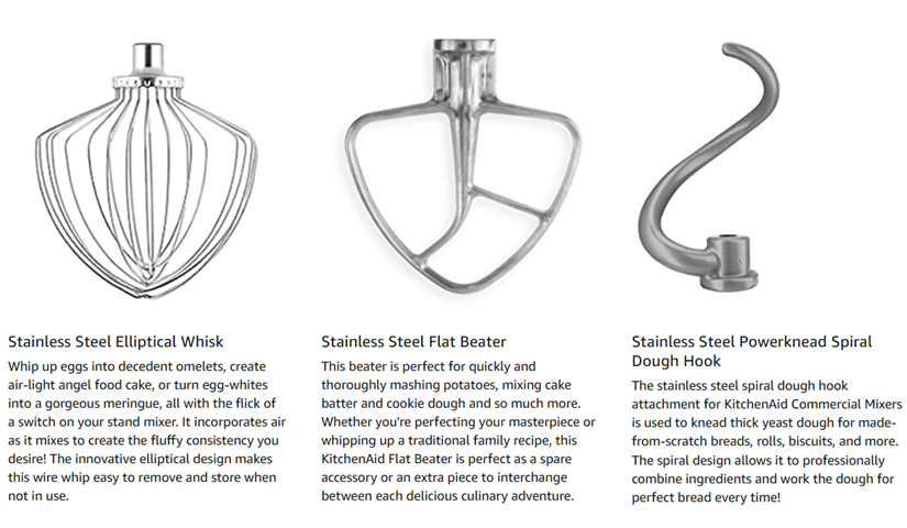 • Stainless steel bowl, wire whip, flat beater, and spiral dough hook