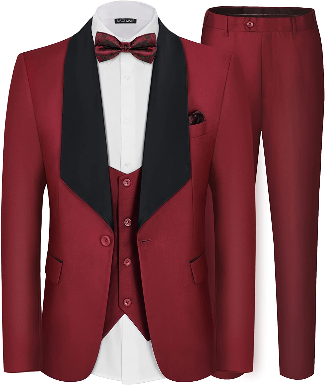 FEATURE:Blazer: One Button Closure,Single Breasted,Shawl Collar,Side Vents,Slim Fit Style;Vests:Four Button,U-Neck, Back Have Adjustable Back Tie;Pants:Flat Front,Zippered Fly,Button End and Adjustable Waist Tab.