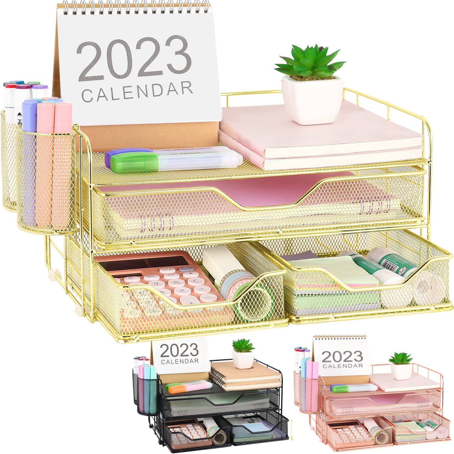 ? [Perfect Paper Organizer] Desk drawer organizer has open top storage space+2 hanging pen holders+3 different drawers. It is convenient for you to quickly identify and sort out desk accessories, letters, and greatly improve your work efficiency.