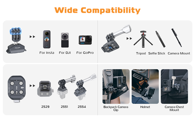 - Wide Compatibility: The Quick Release Kit is compatible with a wide range of action cameras, such as GoPro 10/11 and DJI OSMO Action 2/3 and those with a conventional GoPro interface. Note: Do not over-tighten the knob when no device is installed.