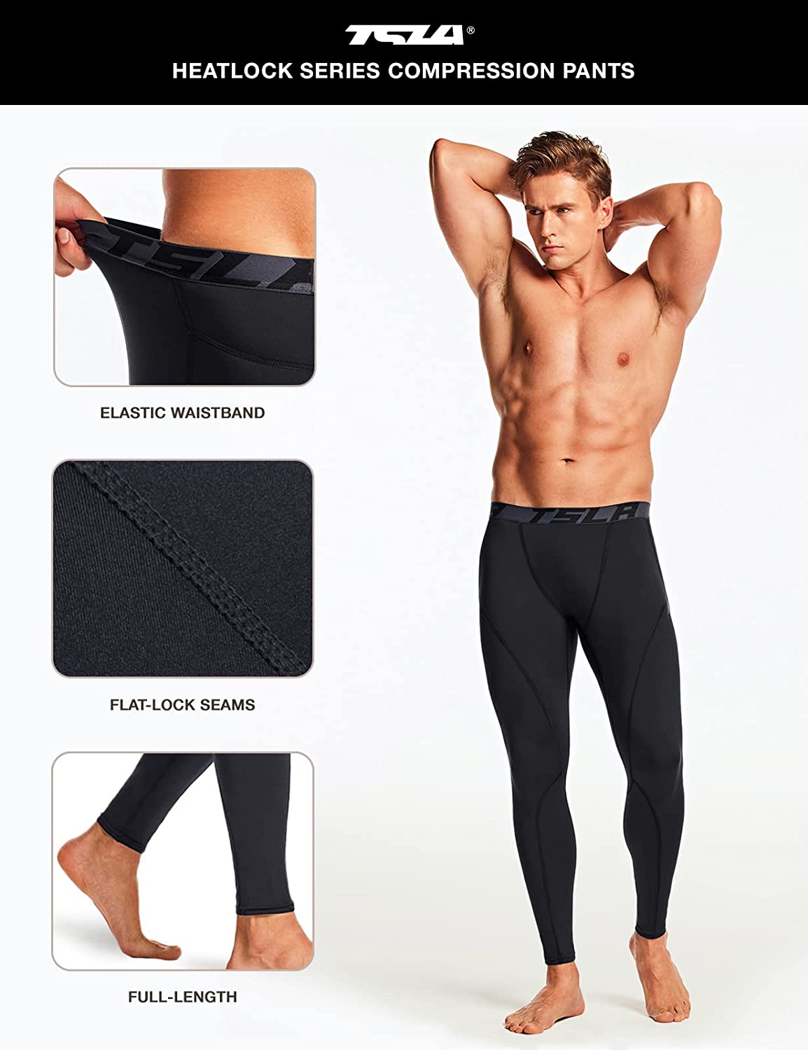TSLA 1 or 2 Pack Men's Thermal Compression Pants, Athletic Sports Leggings & Running Tights, Wintergear Base Layer Bottoms