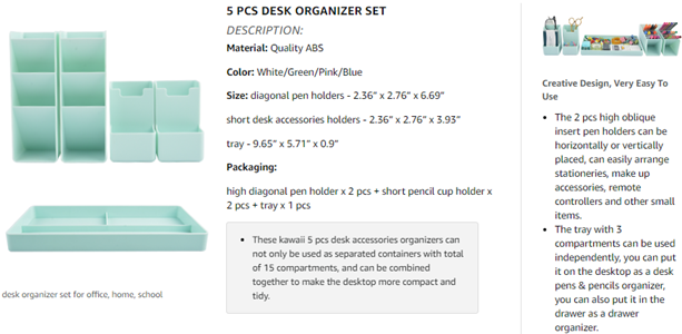 Included Components | insert pencil holder x 2, short organizer x 2, tray x 1 |
