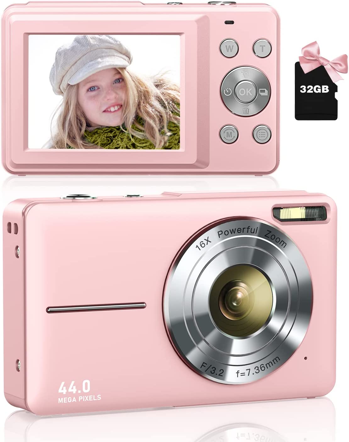 Digital Camera for Kids, Lecran 1080P 44MP Kids Camera with 32GB Card Point and Shoot Camera with 16X Zoom, Compact Portable Cameras Christmas Birthday Gift for Children Kids Teens Girl Boy(Pink)
