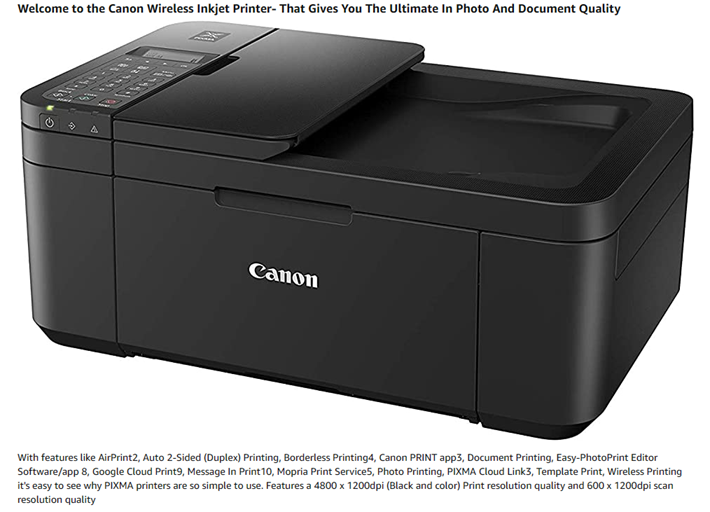 - PRINTING FEATURES: With features like AirPrint2, Auto 2-Sided (Duplex) Printing, Borderless Printing4, Canon PRINT app3, Document Printing, Easy-PhotoPrint Editor Software/app 8, Google Cloud Print9, Message In Print10, Mopria Print Service5, Photo Printing, PIXMA Cloud Link3, Template Print, Wireless Printing it's easy to see why PIXMA printers are so simple to use. Features a 4800 x 1200dpi (Black and color) Print resolution quality and 600 x 1200dpi scan resolution quality