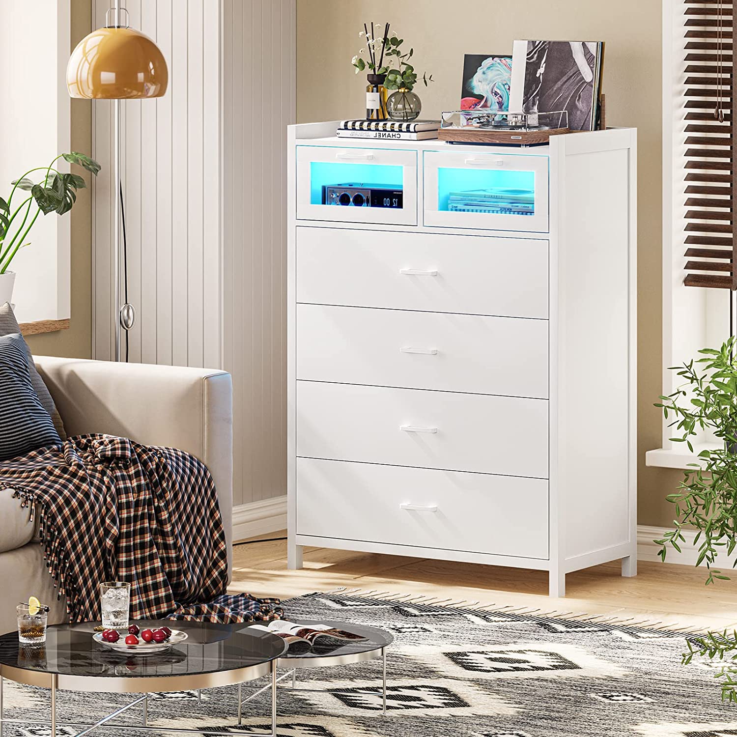 VIAGDO Dresser for Bedroom, Chest of Drawers with LED Lights, White Tall Dresser with 6 Drawers, Wood Large Capacity Storage Cabinet for Nursery, Kids Room, Entryway