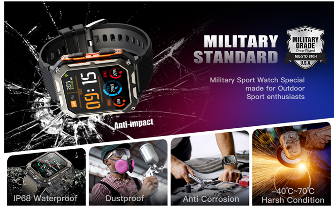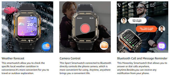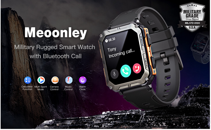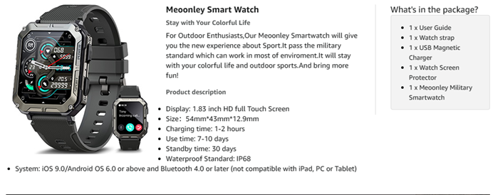 • 【Fitness Smartwatch for Outdoor enthusiasts】This Meoonley Sportwatch designed for outdoor enthusiasts.It pass Military Standard Verification. It can work in most of extreme conditions.And it support IP68 Waterproof standard.You can wear this sport watch while washing hands, walking in the rain or swimming even underwater sports. It can meet all your daily needs even underwater exploration.To enjoy the fun of outdoor exploration.