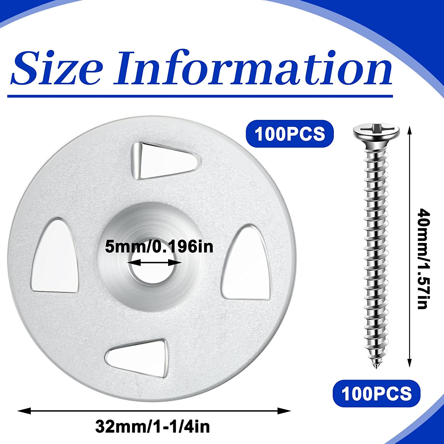 • Sufficient Quantity: you will receive 100 pieces of stainless steel washers with a diameter of 1-1/4 inches, and 100 pieces of stainless steel self tapping screws with a size of about 0.14 x 1.57 inches/ 3.5 x 40 mm; The abundant quantity can meet your various use and replacement needs