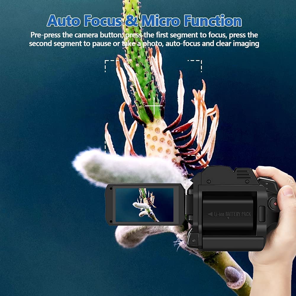 - Camcorder with Auto Focus Function: This new camera has auto focus function, which is the latest function. Pre-press the camera button (there are two sections, press the first section to focus, press the second section to take a picture or video pause), it can automatically focus and clear imaging, shooting distance 0.328 FT~infinity, you can also use 30x digital zoom to see more clearly.