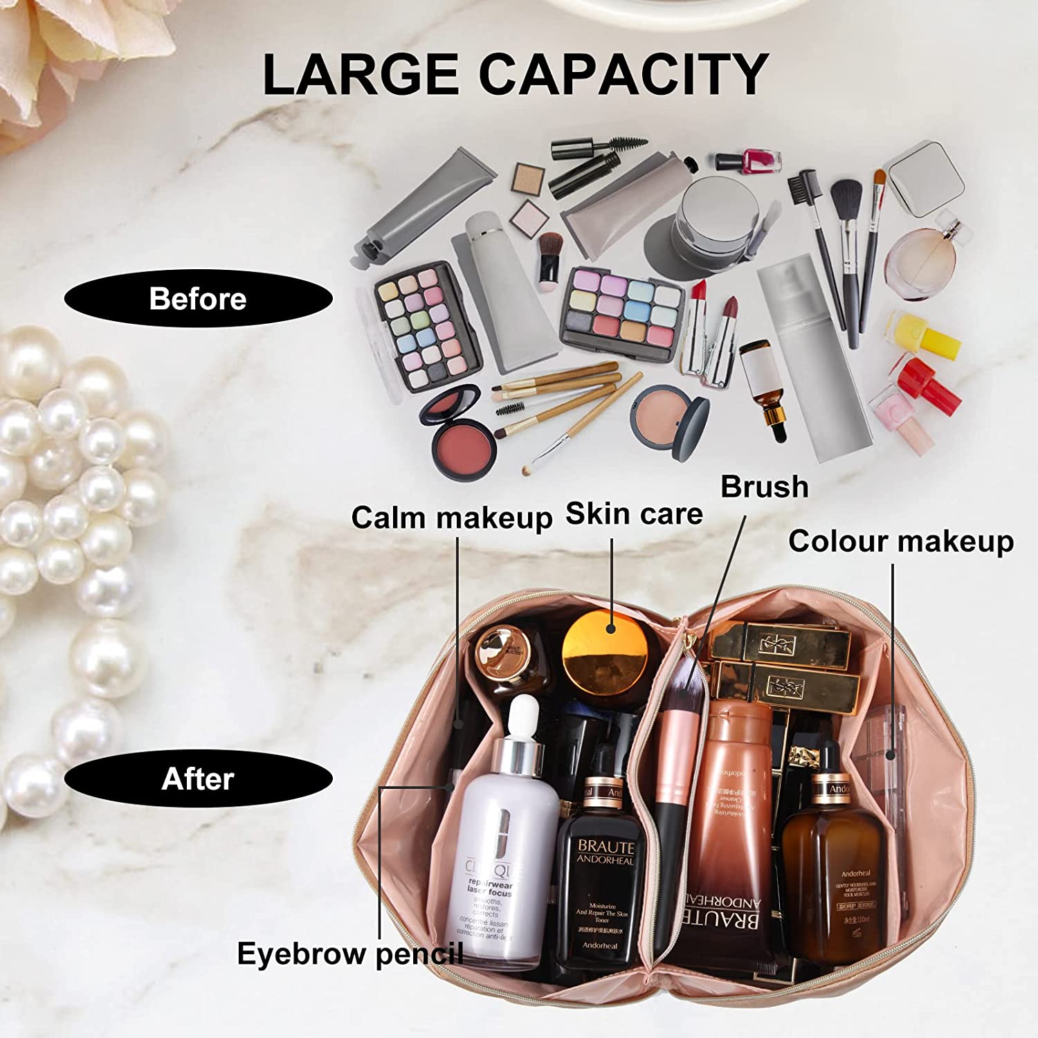 ?LARGE-CAPACITGY COSMETIC BAG :The large capacity travel cosmetic bag is designed with multiple divisions and compartments, which can store not only your cosmetics,makeup bursh,essential oils, Toiletries kits, valuables, etc. It can be organized to accommodate the cosmetics and makeup tools you need;