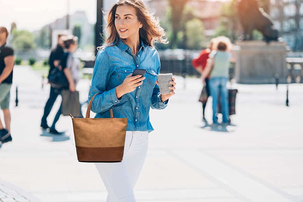 ?[MATERIAL]: The soft leather handbag is made of faux suede, a durable, animal-friendly and easy to clean alternative to real suede. Its simple yet elegant design is spacious enough to carry your laptop or iPad.