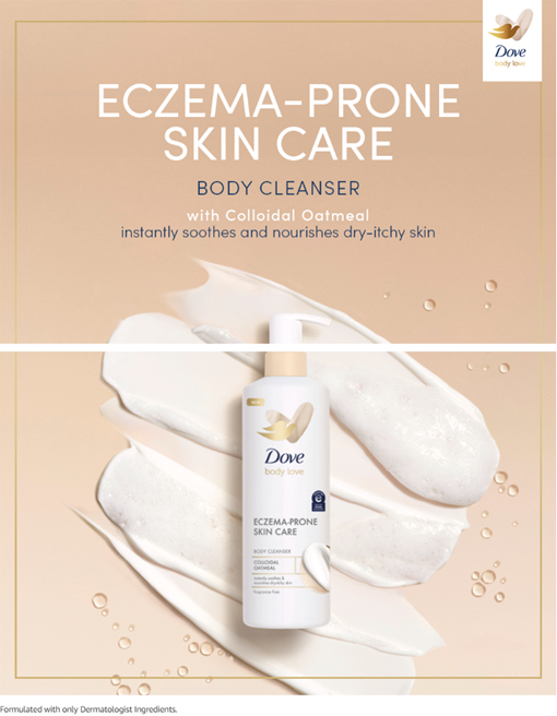 Care for your skin condition now starts in the shower with the Dove Body Love Eczema-Prone Skin Care Body Cleanser with Colloidal Oatmeal to help soothe dry-itchy skin. The paraben-free and sulfate-free body wash is made with plant-based cleansers and 10x Moisture Restore Complex* to transform even the driest skin in just one shower. How To Use: Squeeze a generous amount of Dove Dry-Cracked Skin Replenish Body Cleanser into your palms, or onto a loofah. Naturally, derived cleansers help this body cleanser create a luxurious lather. Smooth the gentle body wash formula over your body and allow the light lather to caress, smooth, and hydrate skin. Rinse with warm water to reveal skin that feels moisturized, smooth, and soft. This body cleanser is Certified PETA VEGAN, and is made in 100% recycled plastic bottles, so you can feel good about switching to Dove. At Dove, our vision is of a world where beauty is a source of confidence, and not anxiety. So, we are on a mission to help the next generation of women develop a positive relationship with the way they look—reaching over ¼ of a billion young people with self-esteem education by 2030. We are also committed to a landmark new initiative as part of our 2025 commitment to reduce plastic waste; reducing over 20,500 metric tons of virgin plastic annually by making the iconic beauty bar packaging plastic-free globally; launching new 100% recycled plastic bottles; and trialing a new refillable deodorant format that radically reduces plastic use. As one of the largest beauty brands in the world, we are revealing an agenda setting commitment to tackle the global beauty industry’s plastic waste issue. *10x the moisturizers of the next leading body wash.