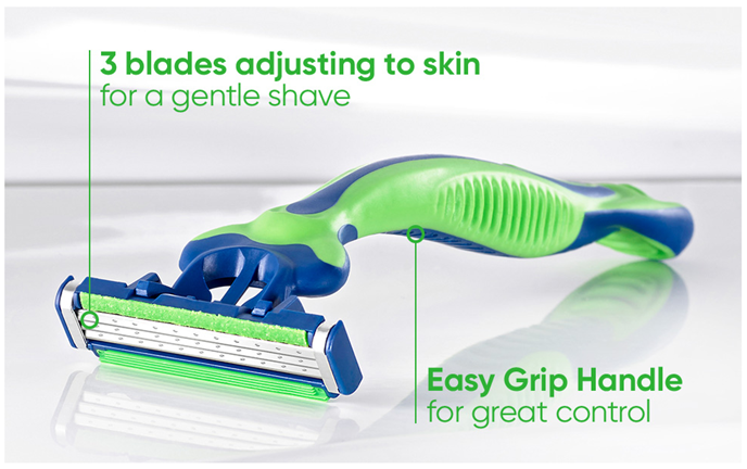- 3 skin sensing blades for a comfortable shave