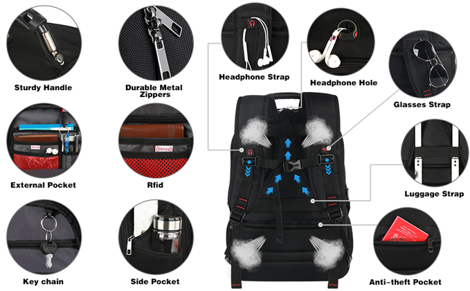 • USB CHARGING & WATER RESISTANT:External USB port with set-in charging cable offers convenient charging your cellphone and other electronic devices everywhere. A hole for headphone outside gives easy access to Earphone usage. The travel backpack made of water-resistant sturdy polyester fabric(long time soaking is not recommended), with heavy-duty locked zippers, which can withstand harsh conditions and heavy use. A rugged handle with steel cable on the top is easy for you to carry with one hand.