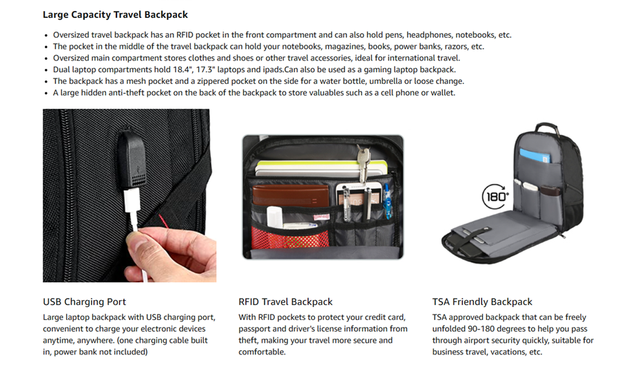 • TSA friendly backpack can be opened freely 90-180 degrees and fastly through airport security.