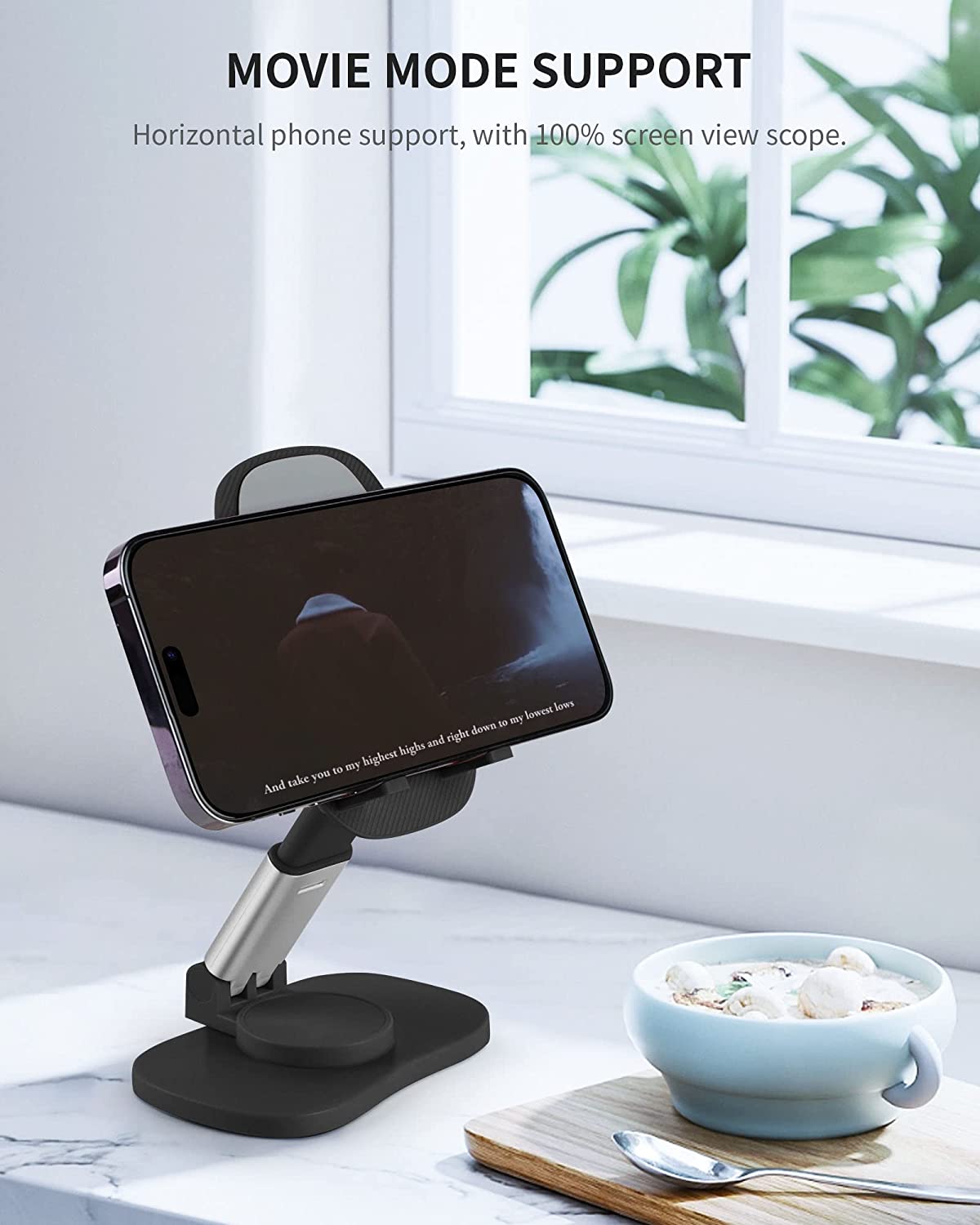 HANDS-FREE ENTERTAINMENT - Having this desktop phone holder to prop up your phone and adjust it to the ideal position, you can free your hands while watching videos, making phone calls, using Facetime, and viewing recipes. Plays a good role in your office, kitchen, nightstand, or dining table.