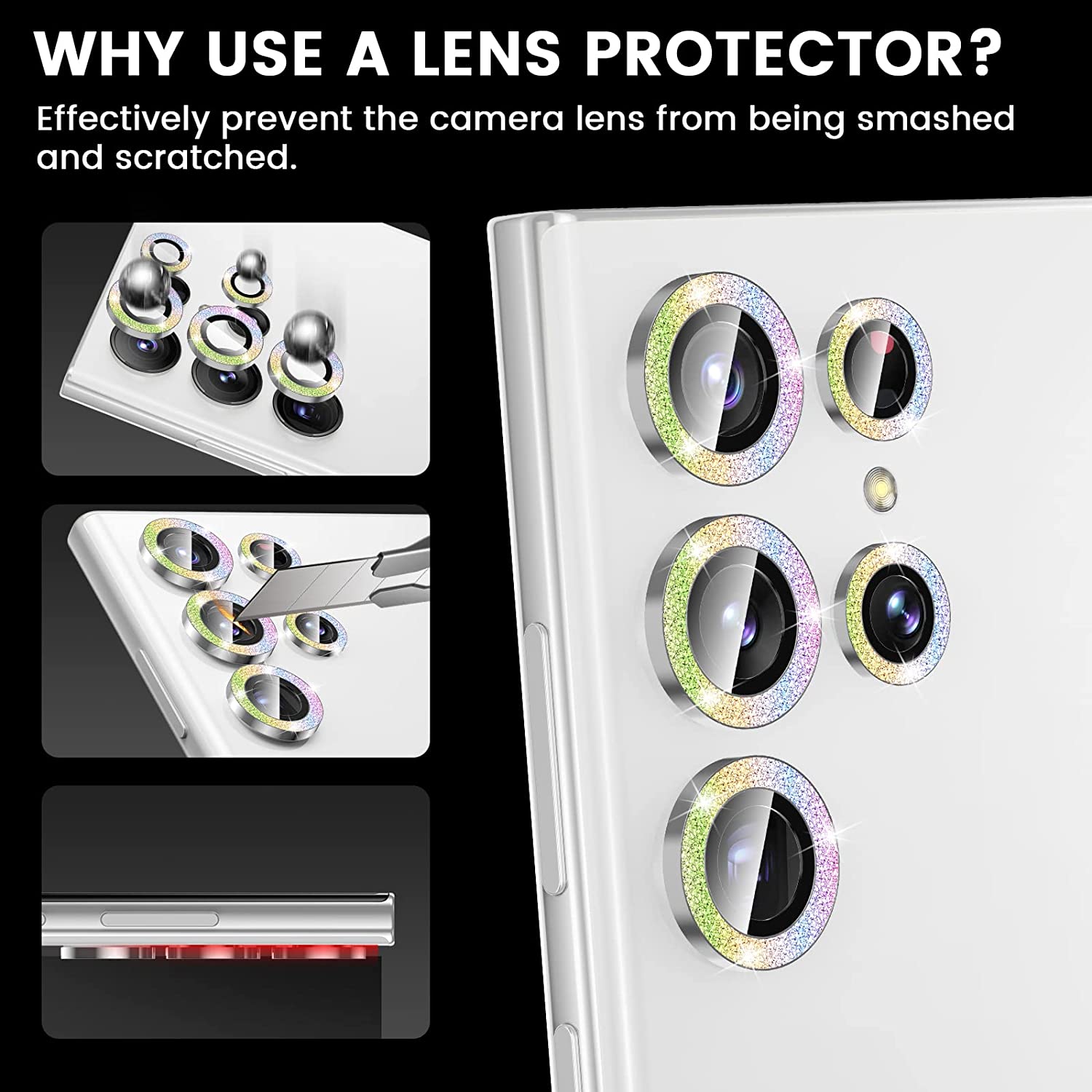 【S23 Ultra Camera Lens Protector】 This S23 Ultra camera lens protector used high-quality aluminum alloy metal and glass screen protector, fully protect your lens, effectively preventing the lens from scratched, dust and bumps. Restore the original color of the phone lens, looks as not installed.