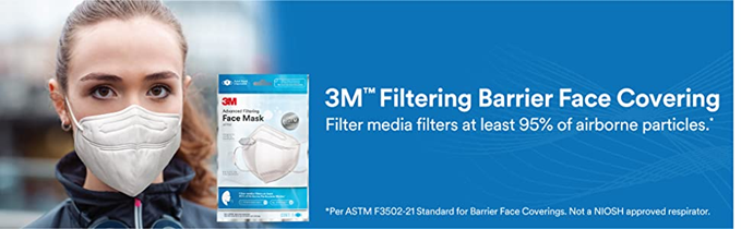 The 3M Filtering Barrier Face Covering is a barrier face covering that can also help reduce airborne particulate exposure, when used as instructed. It can be used in crowded places, airplanes or everyday moments to help filter airborne particles*.*Per ASTM F3502-21 Standard for Barrier Face Coverings; Not a NIOSH approved respirator.