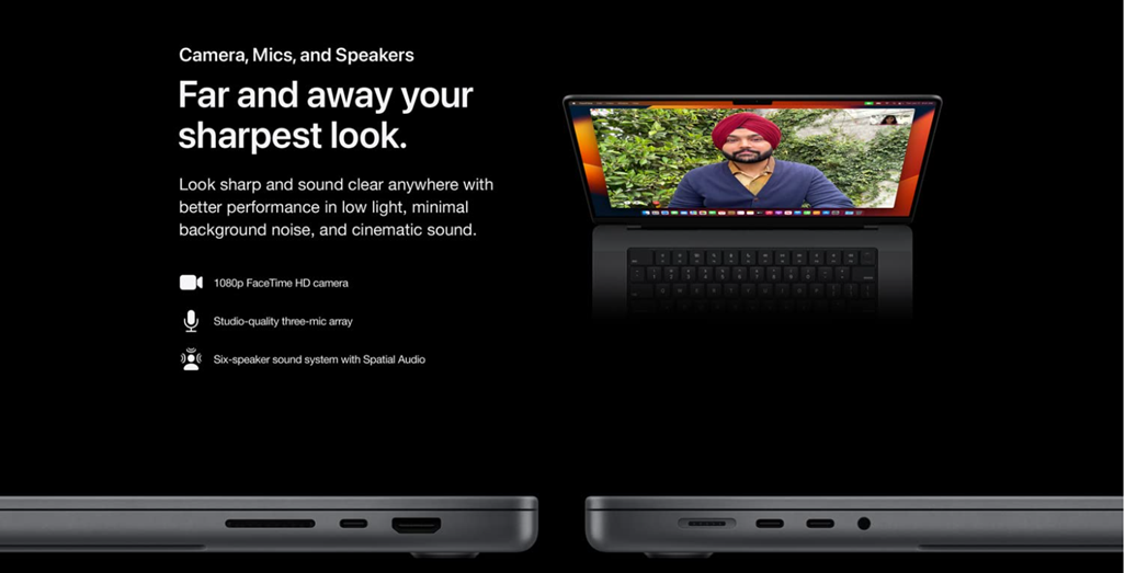Charging and Expansion | Three Thunderbolt 4 (USB-C) ports with support for: Charging, DisplayPort, Thunderbolt 4 (up to 40Gb/s), USB 4 (up to 40Gb/s); SDXC card slot, HDMI port, 3.5 mm headphone jack, MagSafe 3 port |