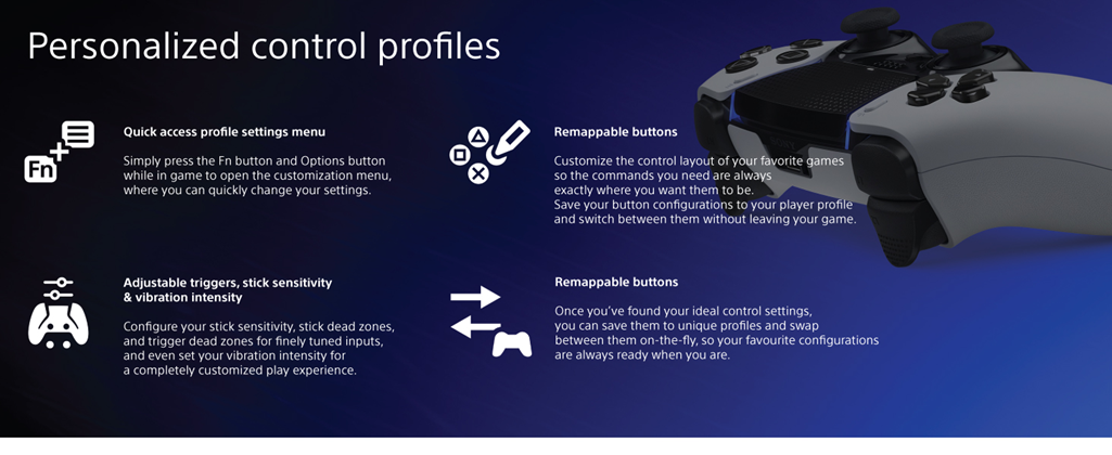 • Mappable back buttons The DualSense Edge wireless controller’s two swappable sets of back buttons can be configured to any other button input, so you’ve always got game-changing actions and essential controls at your fingertips.