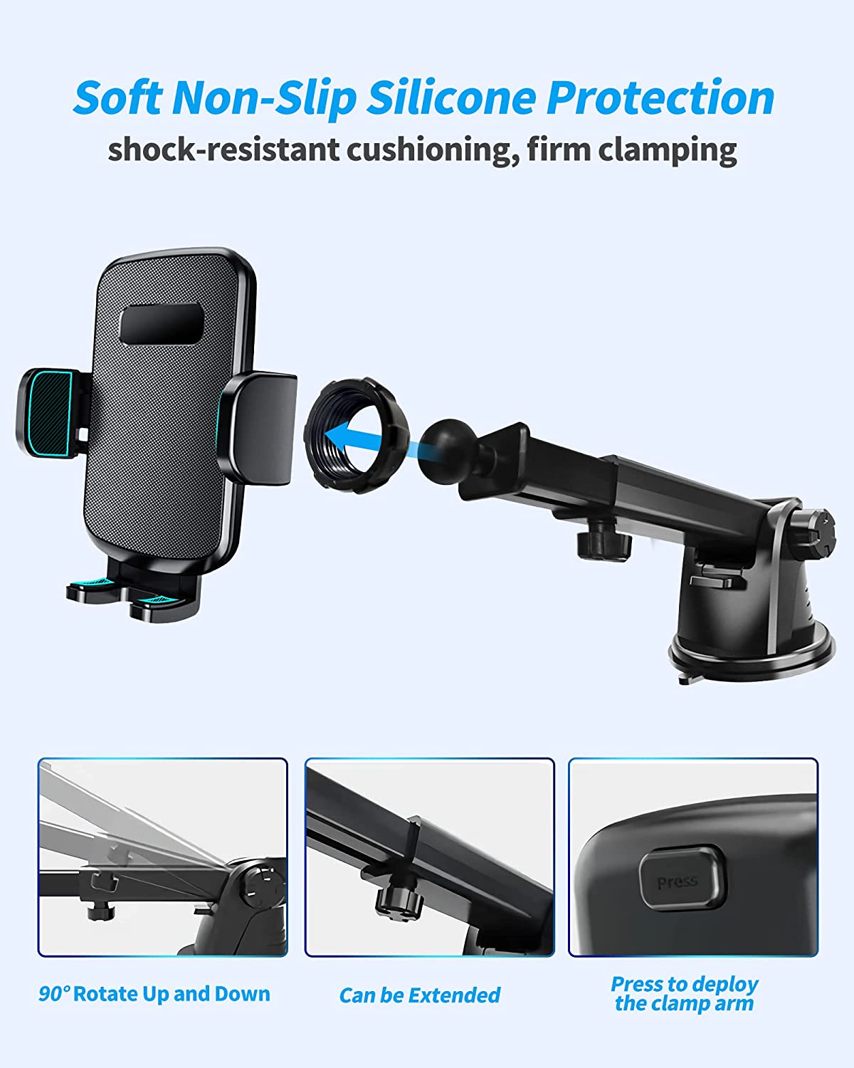 【Easy to Operate】The phone mount for car is easy to operate and can be operated by one hand. Press the button on the back of the car mount to open the clip with one click, and push the clip with one hand after placing the phone. This phone holder for car is suitable for 4-7 inch mobile phones, including all mobile phones with cases.