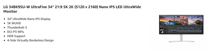 LG 34BK95U-W UltraFine 34" 21:9 5K 2K (5120 x 2160) Nano IPS LED UltraWide Monitor, 600 cd/m2 HDR, Thunderbolt 3 / USB Type-C Inputs Black