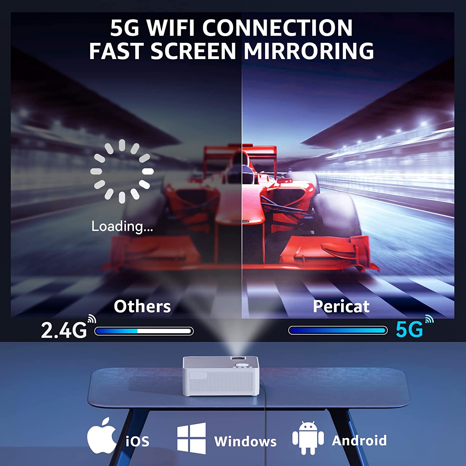 - 2.4G & 5G WIFI Connetion - Fastly wireless connection with your phone and other devices with wider range, and smoother transmission than other traditonal projectors. (Screen Mirroring and Airplay )