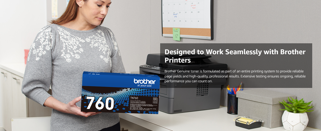 The use of Brother Genuine replacement high yield toner cartridges like the TN 760 not only produces sharp, black and white pages with the quality you expect from Brother products – it also increases productivity and can reduce downtime when fulfilled through Amazon Dash Replenishment. The Brother TN 760 replacement laser black toner cartridge is for use with 9 Brother products. This professional cartridge is intelligently engineered to work in seamless unison without compromising the quality of the print. Upon activation, Amazon Dash Replenishment–eligible Brother printers will seamlessly order Brother Genuine supplies through your Amazon account and ship them directly to your door. The Brother Genuine TN 760 replacement high yield black toner cartridge can print approximately 3,000 pages(1). Once you’ve ordered your replacement cartridges from Amazon, you can feel comfortable knowing that Brother has an environmentally smart solution. Brother is dedicated to being environmentally responsible and offers disposal programs for properly discarding its cartridges. This replacement cartridge is for use with the following Brother printers and all in ones; DCPL2550DW, HLL2350DW, HLL2370DW, HLL2370DWXL, HLL2390DW, HLL2395DW, MFCL2710DW, MFCL2750DW, MFCL2750DWXL.